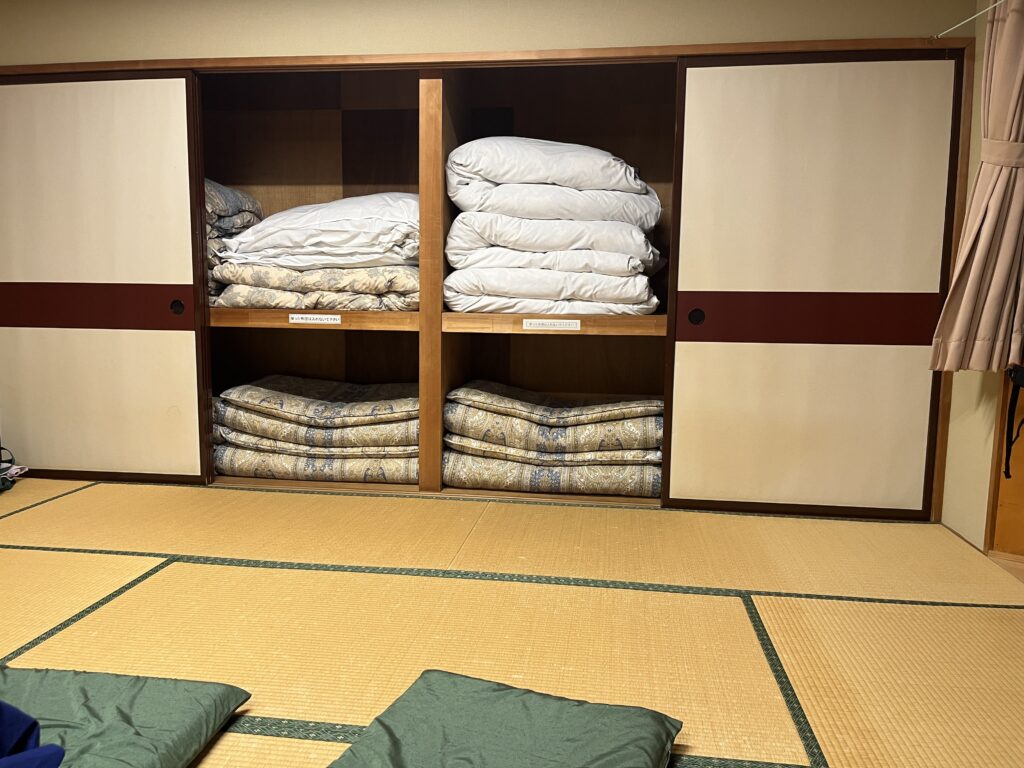 いわゆる「合宿所」で、12畳くらいの部屋に、みんなで布団を敷いて寝るスタイル。今回は4人で宿泊なので広々快適。